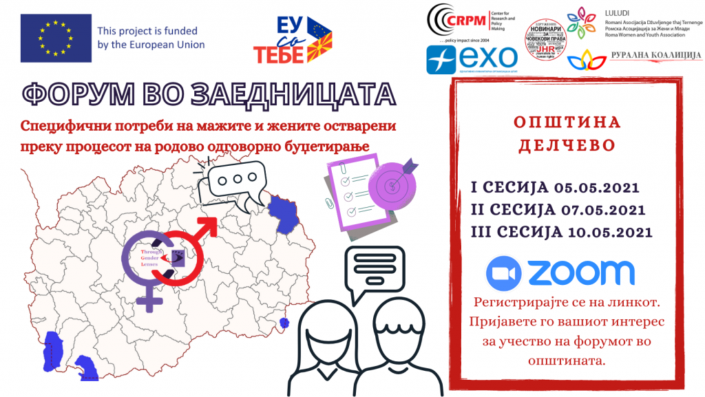 Во наредните два месеца во рамки на проектот „Низ женски леќи: покревање на политики и буџетски иницијативи, следење на спроведувањето на локалните акциски планови за родова еднаквост“, финансиран од Европската Унија, ќе организираме 17 форуми во заедниците. Форумите се на тема- Специфичните потреби на мажите и жените остварени преку процесот на родово одговорно буџетирање.