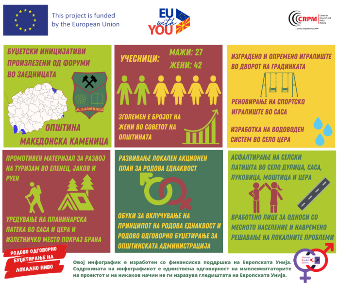 Целта на проектот е унапредување на родовата еднаквост преку воведување на родово еднакво буџетирање во ЕЛС Македонска Каменица.