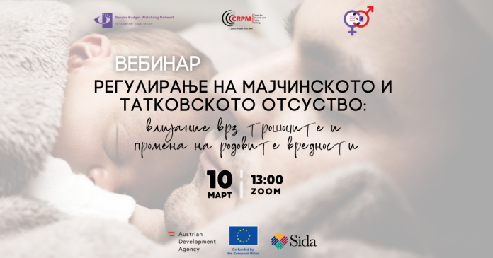 Мрежата за родово-одговорно буџетирање (МРОБ) со задоволство ве поканува на првиот вебинар за оваа година насловен „Регулирање на мајчинското и татковското отсуство – влијание врз трошоците и промена на родовите вредности“. Вебинарот ќе се одржи онлајн преку платформата Zoom на 10-ти март (петок), 2023 година со почеток во 13:00 часот.