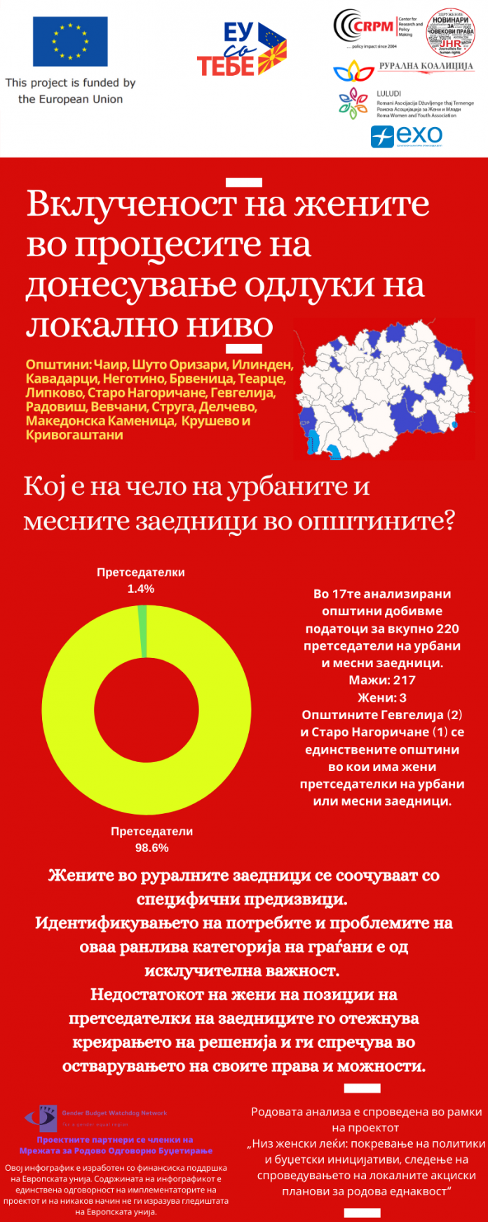 📢❌ Анализата покажува апсолутна родова нееднаквост во раководењето со урбаните и месните заедници на општините. Од вкупно анализирани 220 урбани и месни заедници, 217 се водени од мажи.