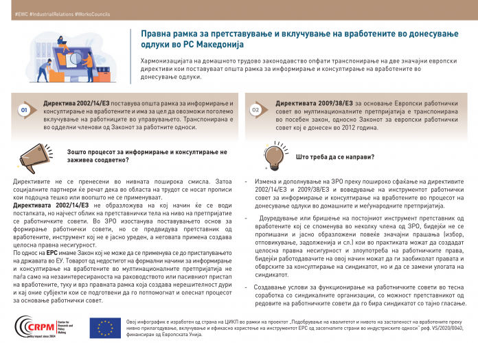 Во најновиот инфографик погледнете дел од причините заради кои процесот на информирање и консултирање не заживеа соодветно во државата (преку работничките совети во домашните и мултинационалните претпријатија), со препораките за подобрување и усогласување на правната рамка.