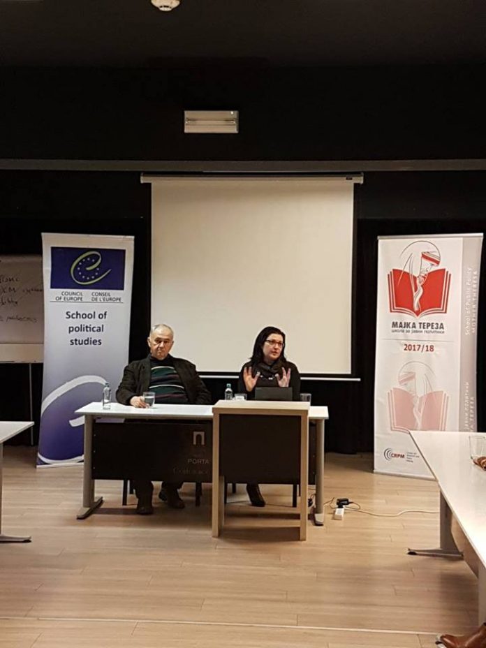 Во четврток на 07 Декември во 18 часот во хотел Порта гостин предавач на Школо за јавни политики Мајка Тереза беше Тања Томиќ (поранешен пратеник во собранието на РМ) која говореше на тема ” Менаџмент на човечки ресурси во политички партии.”
