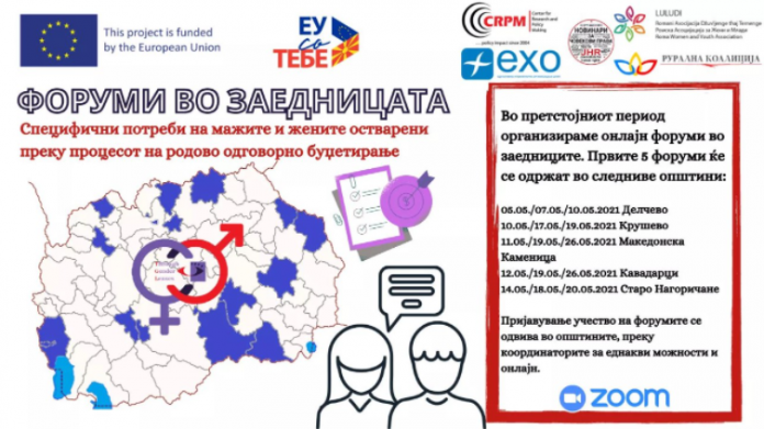 Во наредните два месеца во рамки на проектот „Низ женски леќи: покревање на политики и буџетски иницијативи, следење на спроведувањето на локалните акциски планови за родова еднаквост“, финансиран од Европската Унија, ќе организираме 17 форуми во заедниците. Форумите се на тема- Специфичните потреби на мажите и жените остварени преку процесот на родово одговорно буџетирање.
