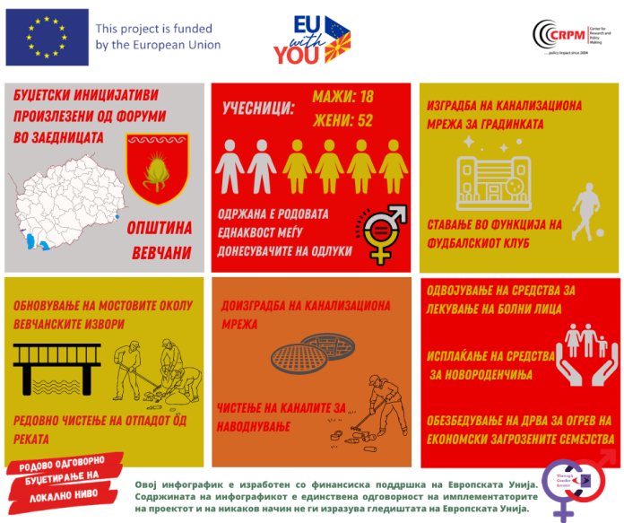 Во месец мај 2021 во Општина Вевчани спроведовме форум во заедницата на кои учествуваа 52 жени и 18 мажи во рамки на проектот „Низ женски леќи: покревање на политики и буџетски иницијативи, следење на спроведувањето на локалните акциски планови за родова еднаквост“.