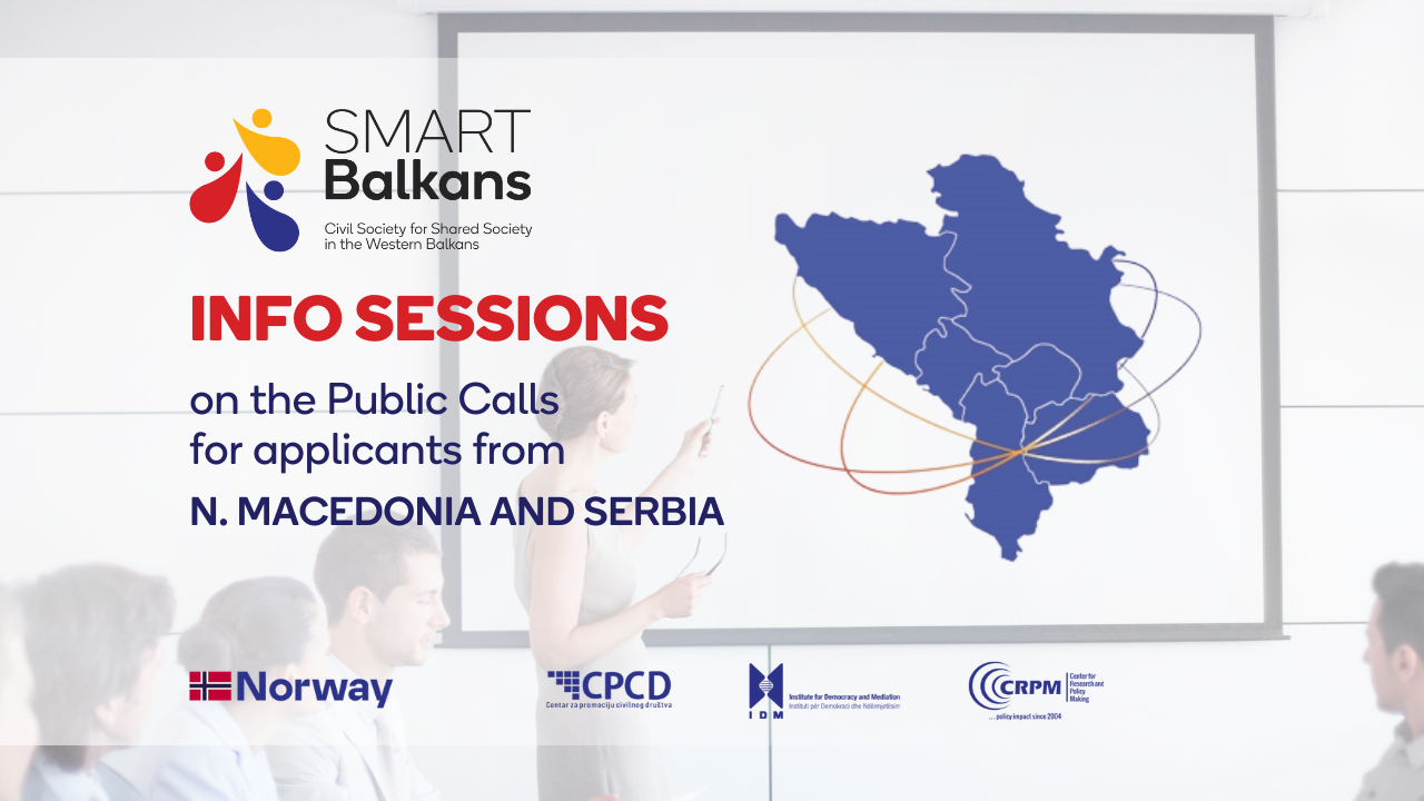 The consortium of oganizations implementing the SMART Balkans project opened four public calls for grants – National Interventions, Local Initiatives, Creative Box and Media Grants that will last until February 15th, 2023. For that reason, the Center for Research and Policy Making (CRPM) organized online information sessions for representatives of civil society organizations and all interested parties from N. Macedonia and Serbia.