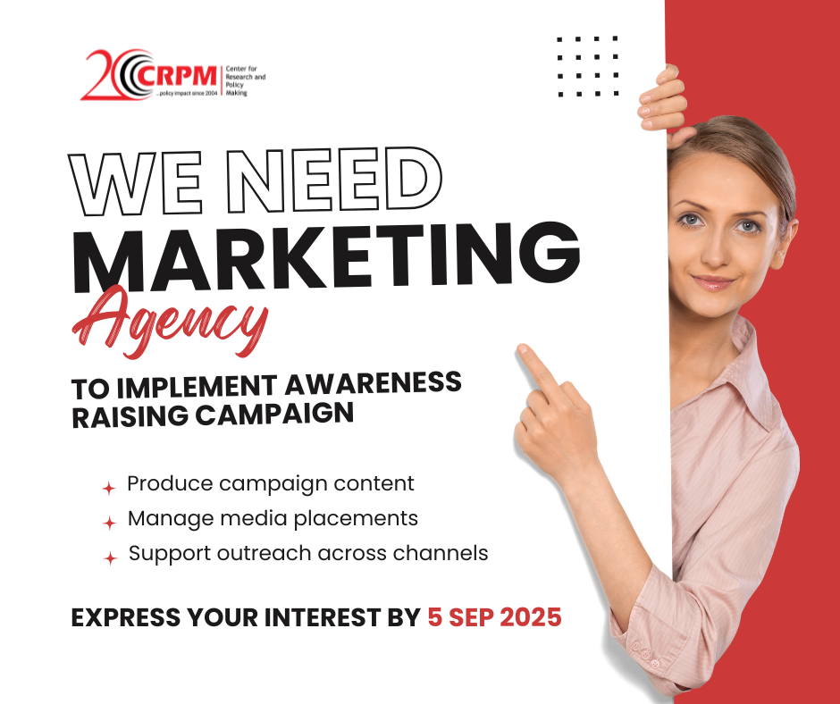The Center for Research and Policy Making (CRPM), in partnership with GIZ and the German Cooperation, is seeking a Marketing Agency to support the nationwide promotional campaign for the newly adopted Law on Work Engagement of Persons.