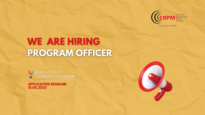 Please send your CV and motivation letter to crpm@crpm.org.mk with the title “Application for Program Officer”, no later than 15.05.2023.