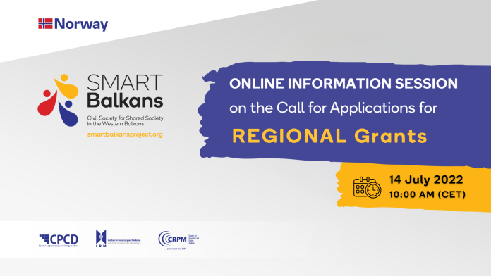 Centar za istraživanje i kreiranje politike (CRPM) u saradnji sa partnerskim organizacijama Centar za promociju civilnog društva(CPCD) i Institute for Democracy and Mediation (IDM) uz podršku Ministarstva spoljnih poslova Kraljevine Norveške organizuje informativnu sesiju u okviru projekta SMART Balkans, o pozivu za dodelu Regionalne grantove za zainteresovane organizacije civilnog društva iz S. Makedonije, Srbije, Bosne i Hercegovine, Albanije, Kosova i Crne Gore.